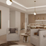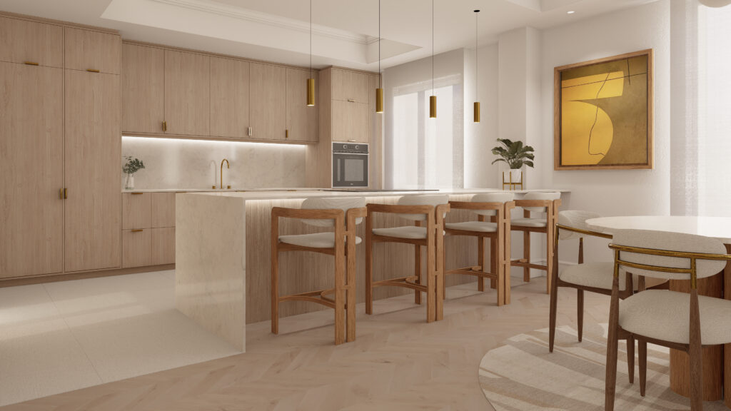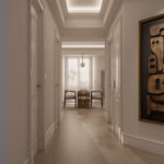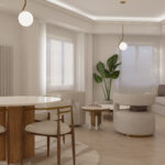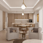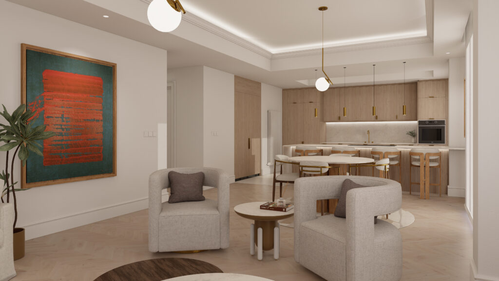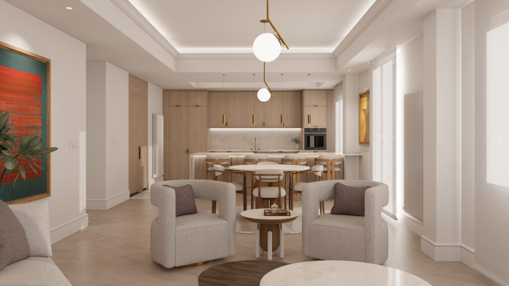 Spacious open-plan living-dining-kitchen area with indirect lighting and decorative moldings on the ceilings.