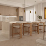 Large-format (120×120) flooring, wall coverings, and countertops by PORCELANOSA.