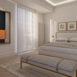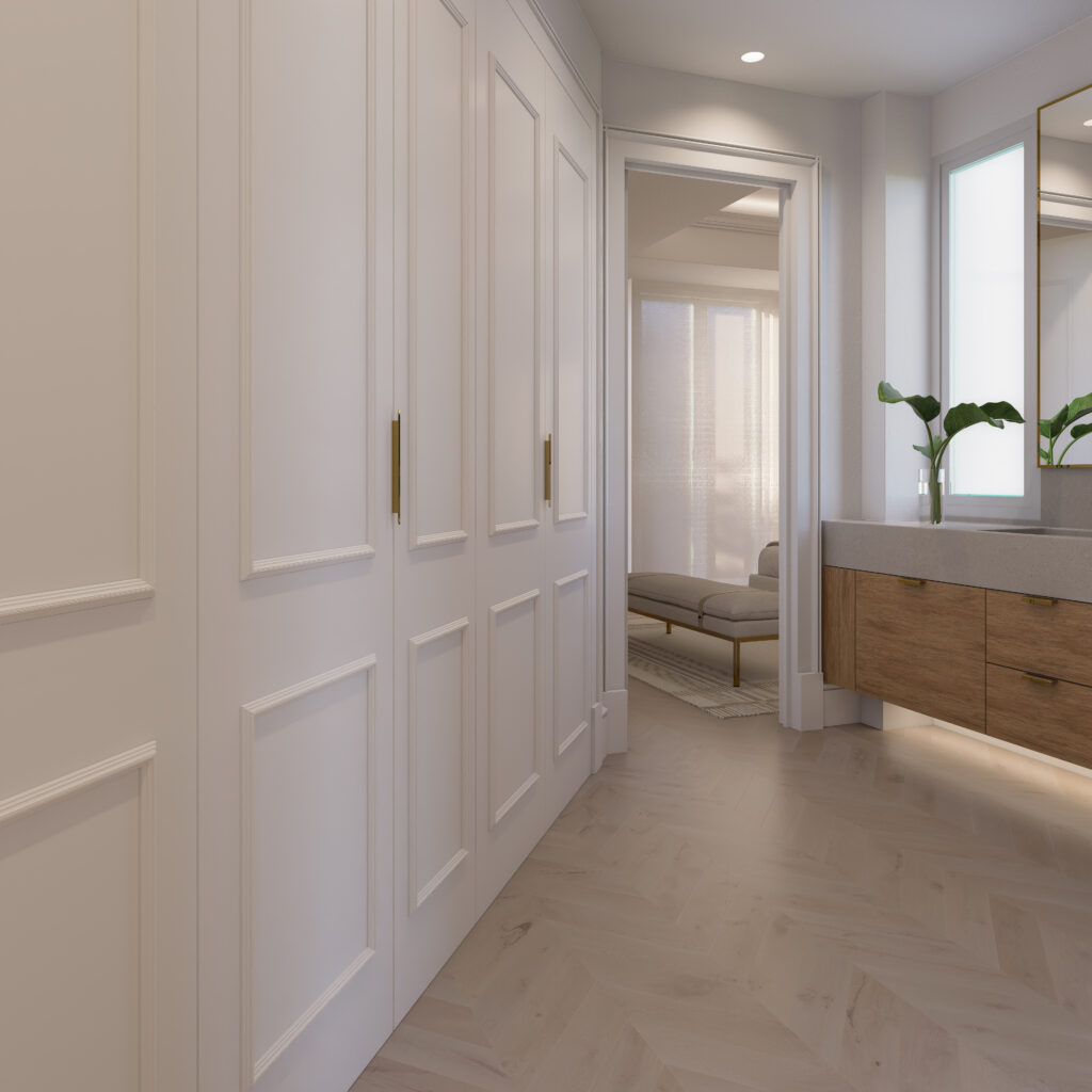 Molded doors and wardrobe fronts (220 cm) with magnetic closures and matte brass handles.
