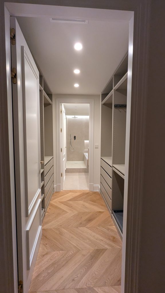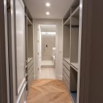 Molded doors and wardrobe fronts (220 cm) with magnetic closures and matte brass handles.